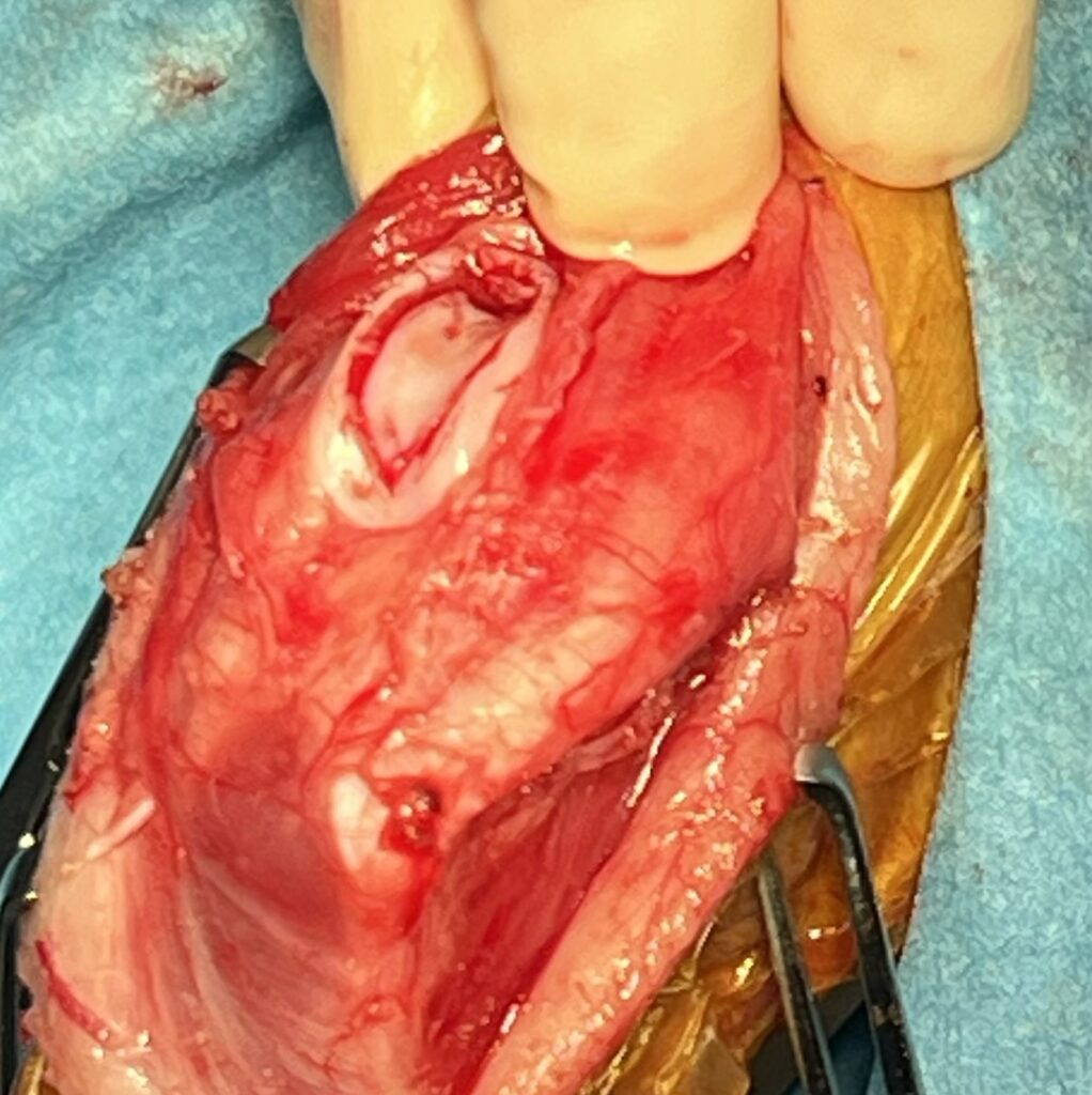 脛骨粗面転移術はすべての症例に適応するわけではありませんが、脛骨粗面の内側への変位が強い場合にアライメント矯正のため行っています。アライメント矯正とは、膝回りの骨や関節を正常な位置配列にすることで、今回の場合は大腿骨滑車に対して脛骨粗面が正面にくるように外側に動かしています。(レントゲンの赤線)