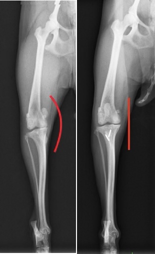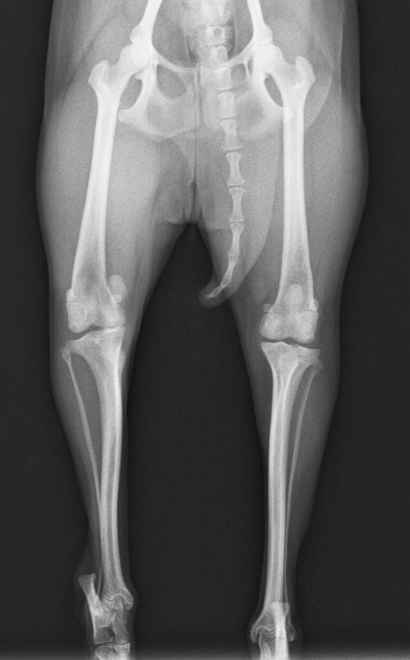 ・右膝:膝蓋骨内方脱臼Grade3、クリック音(+)。明らかな痛みはないが、歩行時に脱臼すると右脚を挙上してぴょんぴょん跳ねる