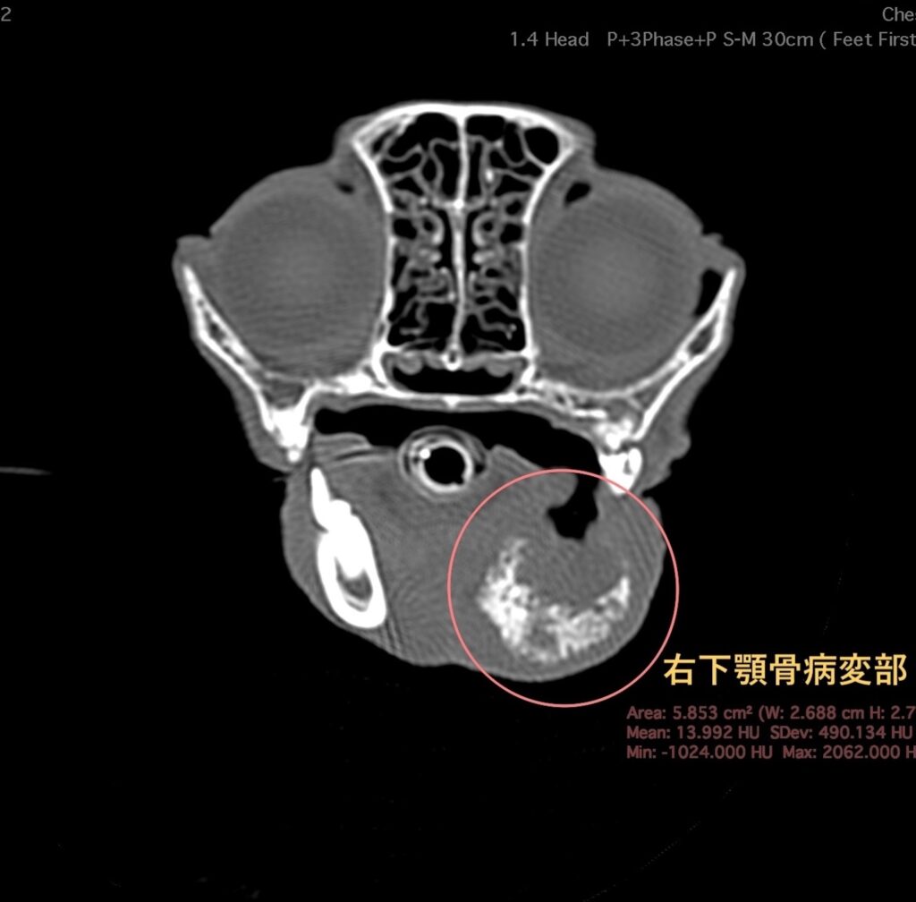 CT検査で右下顎骨の骨融解、骨増生を認める。
