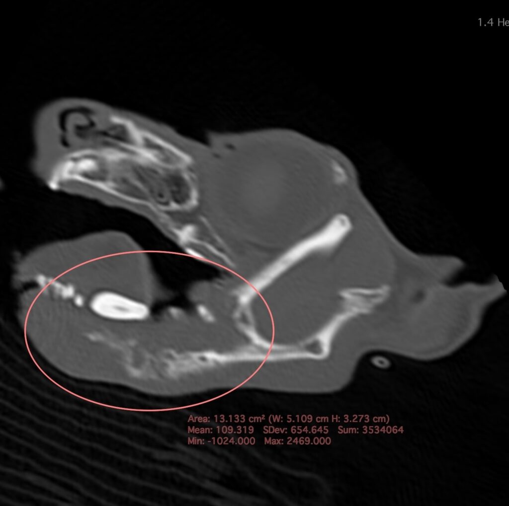 臨床経過と診察時の所見から下顎の腫瘍を疑い、2日後に全身麻酔下でのCT検査を行う。