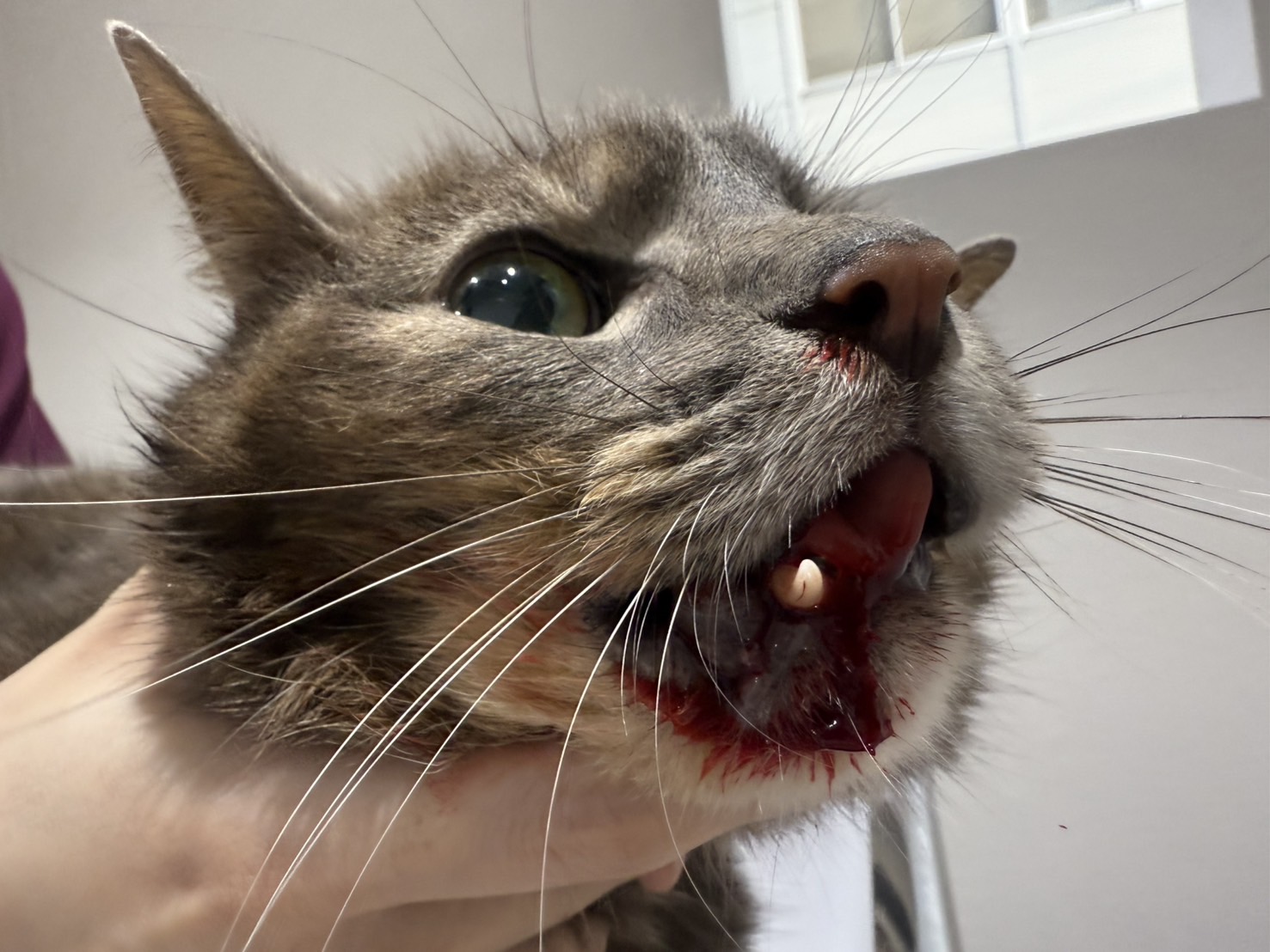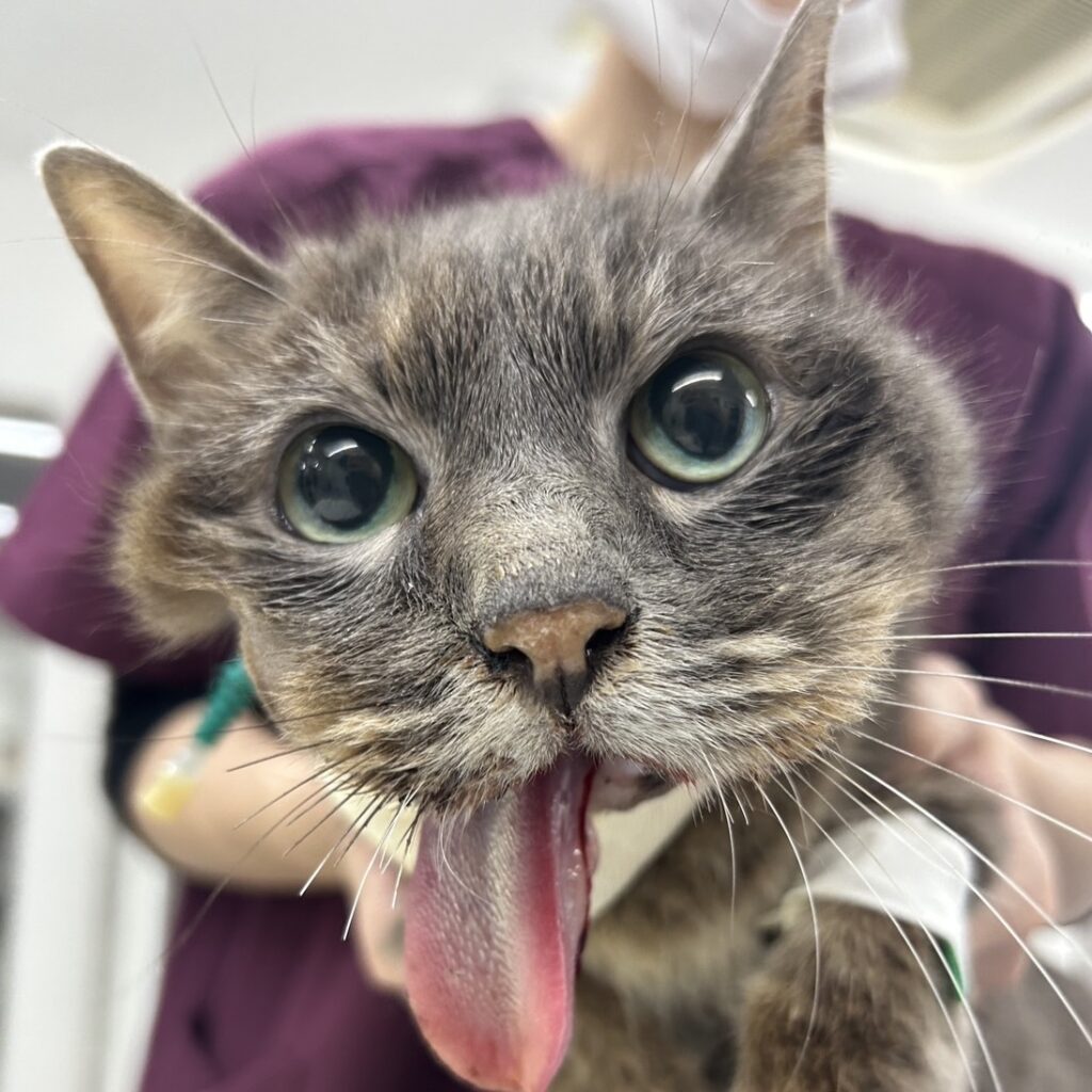 流涎やチューブ管理のため、カラーは着用したまま、ご家族と二人三脚で懸命に毎日を生きてくれています。猫の扁平上皮癌は非常に根治が難しい病気ですが、1日でも長く、お家で穏やかな日々を過ごしてくれることを心から願うばかりです。