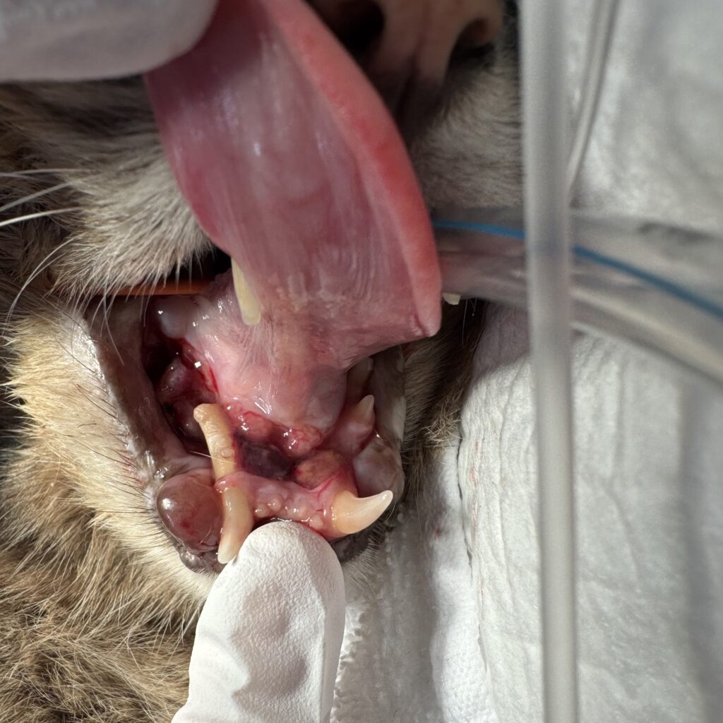 扁平上皮癌などが強く疑われ、摘出するには両側の下顎と舌を含めた全切除、そこまで行なってもなお再発する可能性があることを飼い主様と慎重に相談しました。