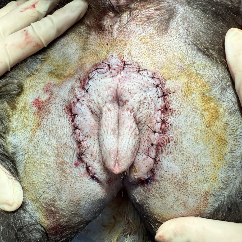 今回の治療のメインではありませんが、飼い主様から手術のご希望をいただいたためこちらも同時に行いました。外陰部はあまり普段からまじまじと観察しない部位ですが、外陰部低形成が比較的若齢犬での再発性細菌性膀胱炎の原因になる場合があります。 手術としては余剰な皮膚を切除して、正常な外陰部の位置・形に形成します。