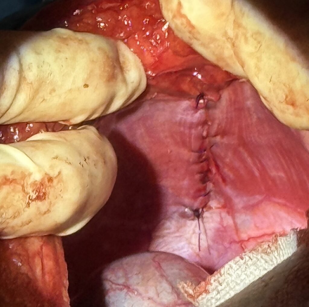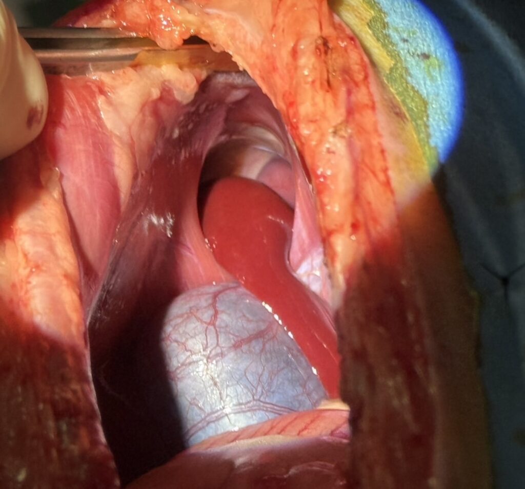 臓器を整復後は、横隔膜の穴を縫合していきます。 今回は癒着などもほとんどない状態でしたので、比較的侵襲少なく処置を終えることができました。