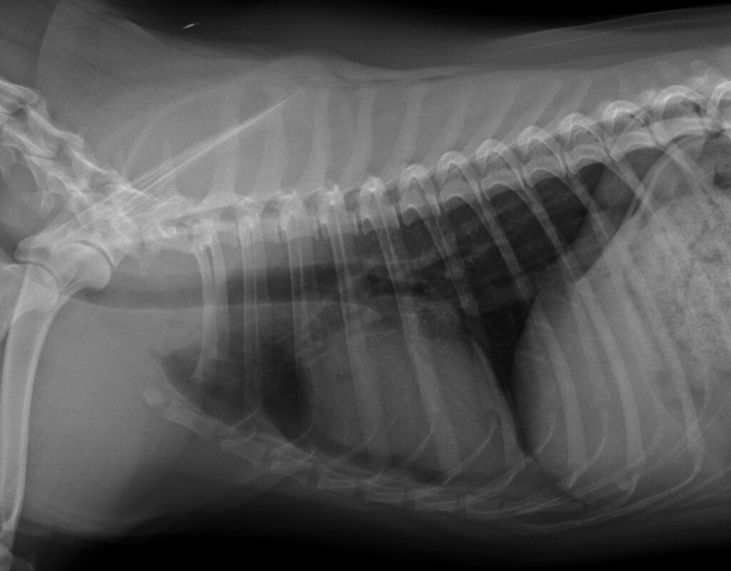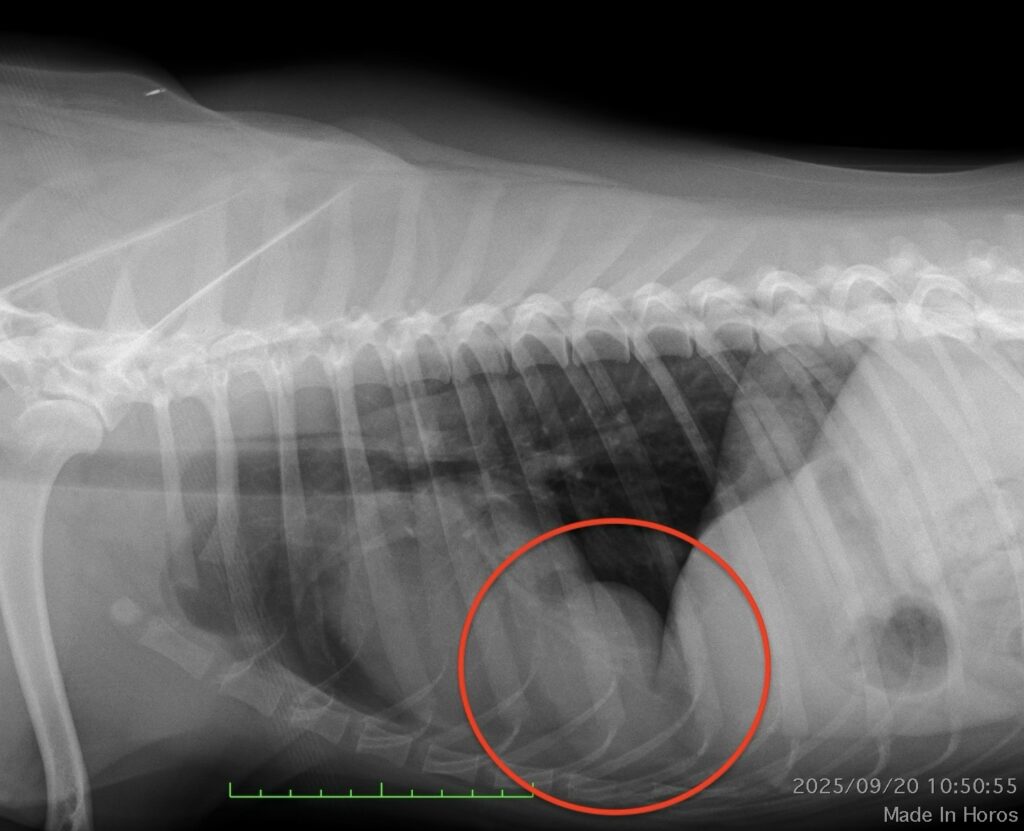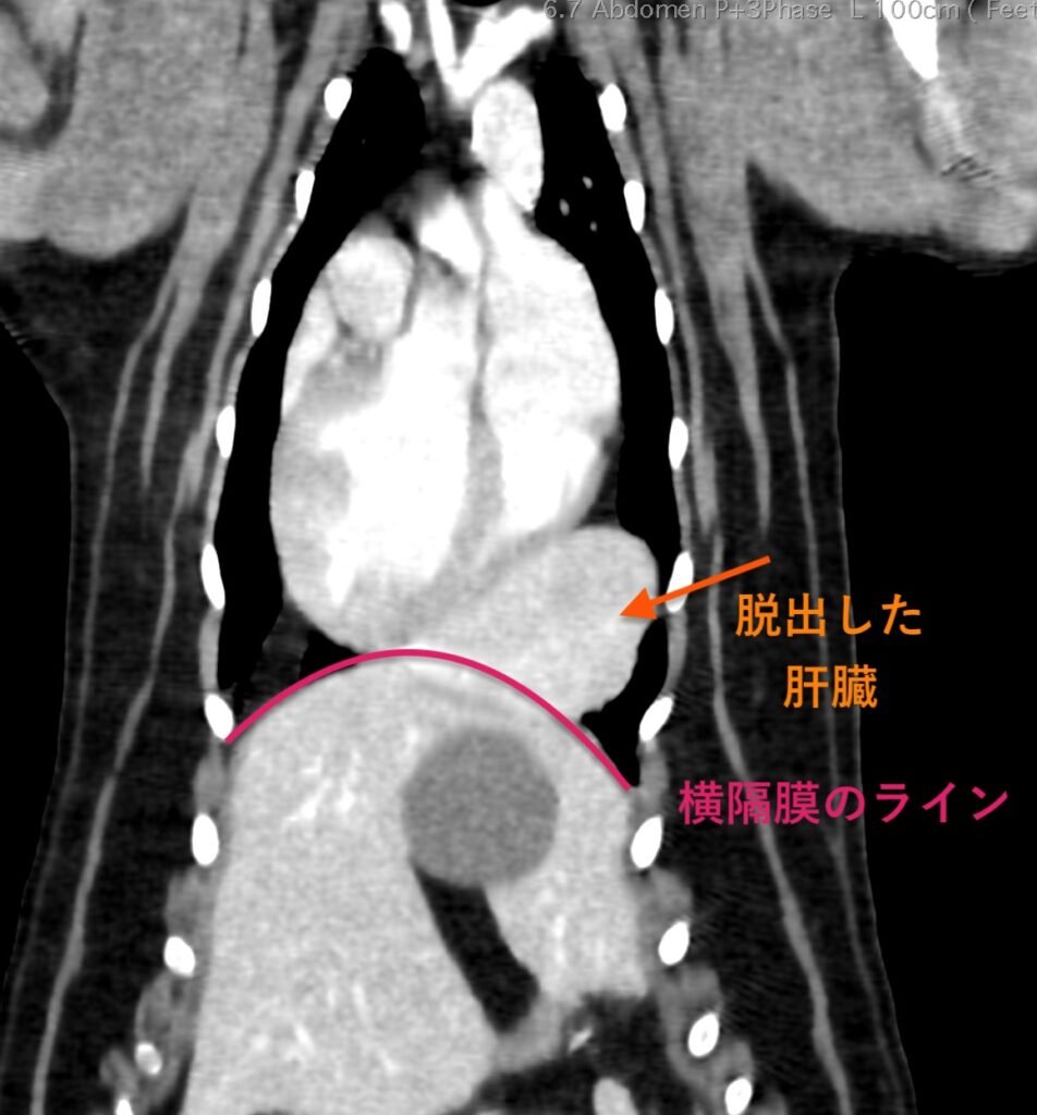 X線、CT検査にて胸腔内(心臓尾側)に肝臓実質(方形葉)が脱出。