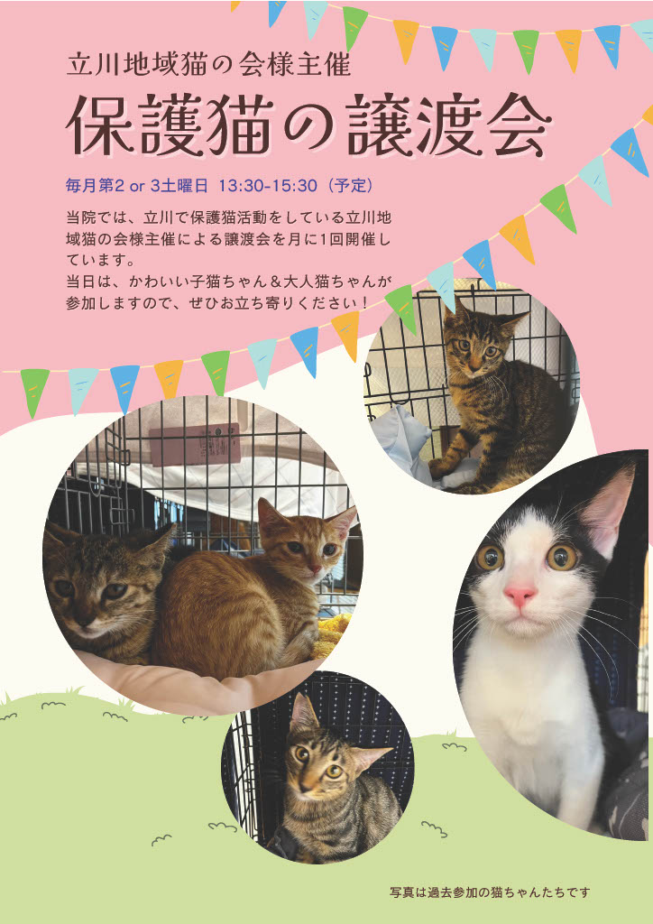 いずれも13時半~15時半の予定です。かわいい子猫ちゃん、大人猫ちゃんたちに会いにお気軽にいらしてください。