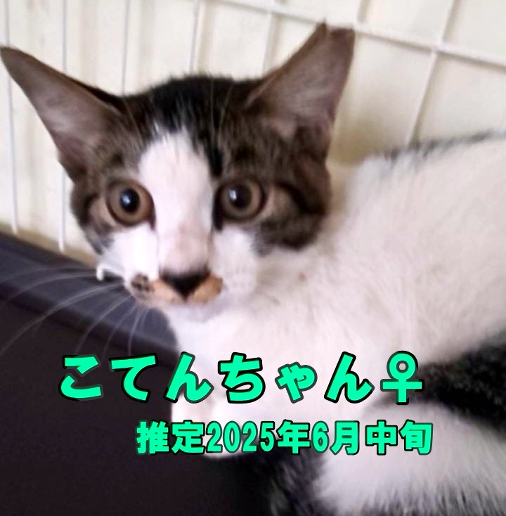 ↓キジシロの女の子、こてんちゃん、4ヵ月。ハチワレ&お鼻の模様がチャームポイント
