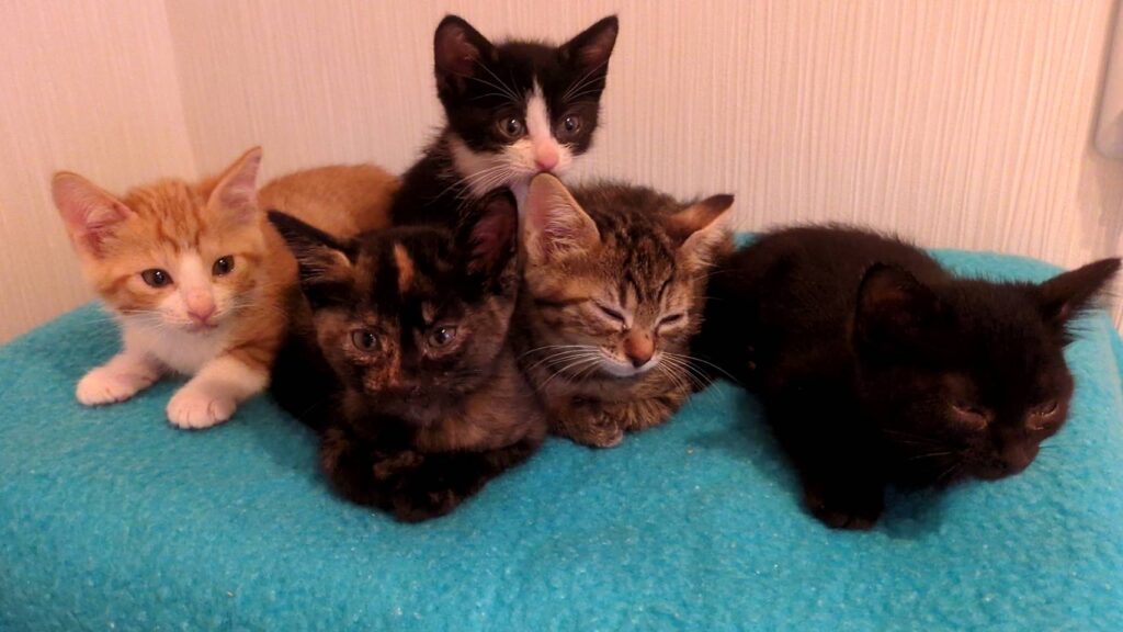 ↓生後2ヵ月くらい、5兄弟(左から茶白、サビ、黒白、キジトラ、黒)、性別?