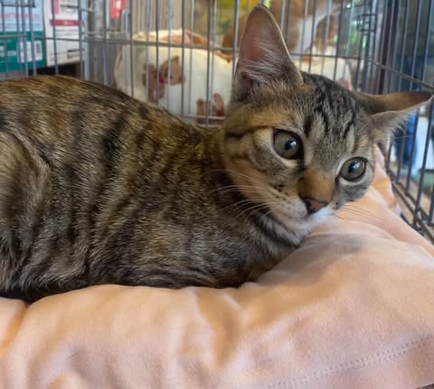性格:保護されたタイミングが遅れたのと性格もあるのか、まだケージ暮らしですが他の猫たちと仲良くしています。
